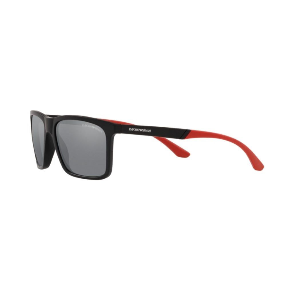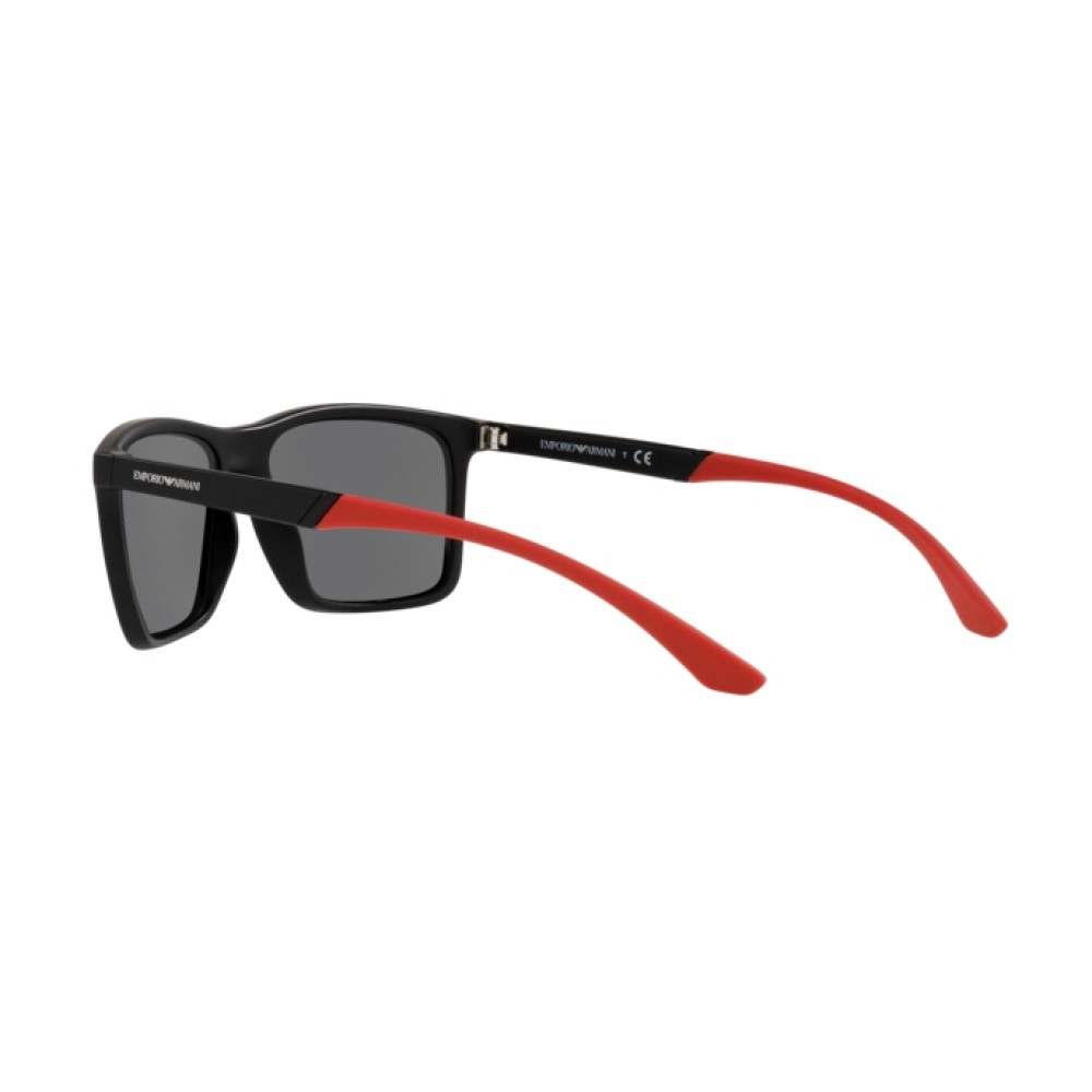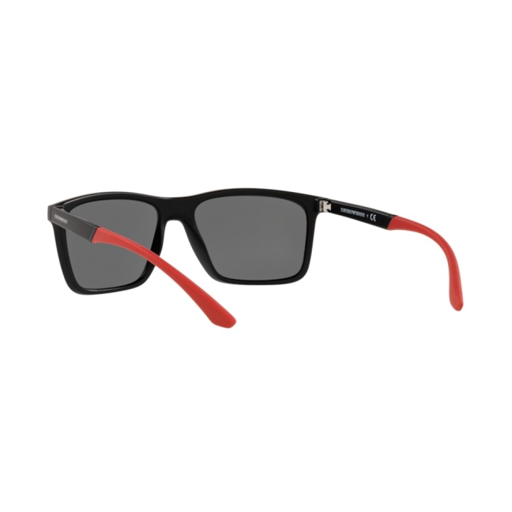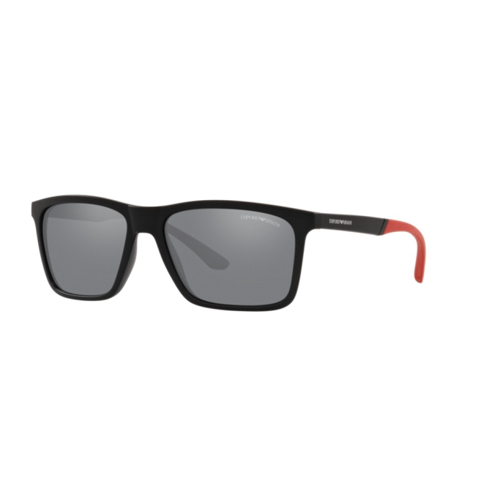 Occhiali da sole Emporio Armani dal look pulito e sportivo. Montatura rettangolare nera con aste rosse e lenti grigie. Un modello facile da abbinare, perfetto per città, guida e tempo libero.