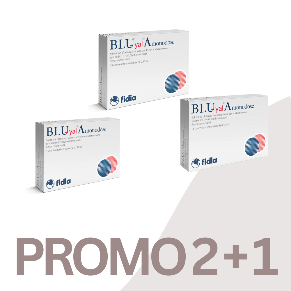 BLU Yal A Monodose è una soluzione oftalmica sterile isotonica senza conservanti, a base di sodio ialuronato allo 0,15% e aminoacidi (L-prolina, L-glicina, L-lisina cloridrato, L-leucina).