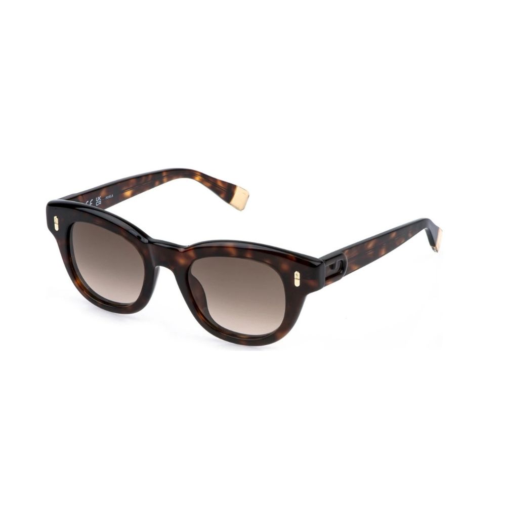 Gli occhiali da sole Furla SFU986 esprimono eleganza e personalità attraverso una montatura in acetato color havana dalle linee morbide e strutturate. La forma ampia valorizza i lineamenti e dona carattere allo sguardo, rendendo il modello adatto sia a look quotidiani sia ad outfit più ricercati.