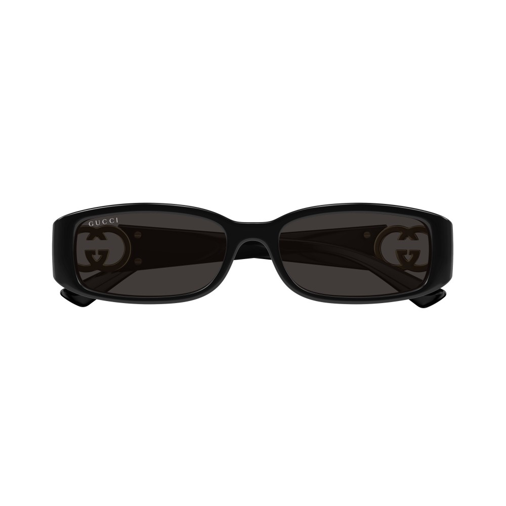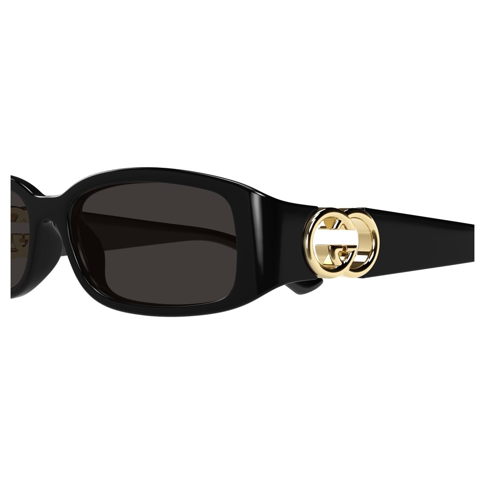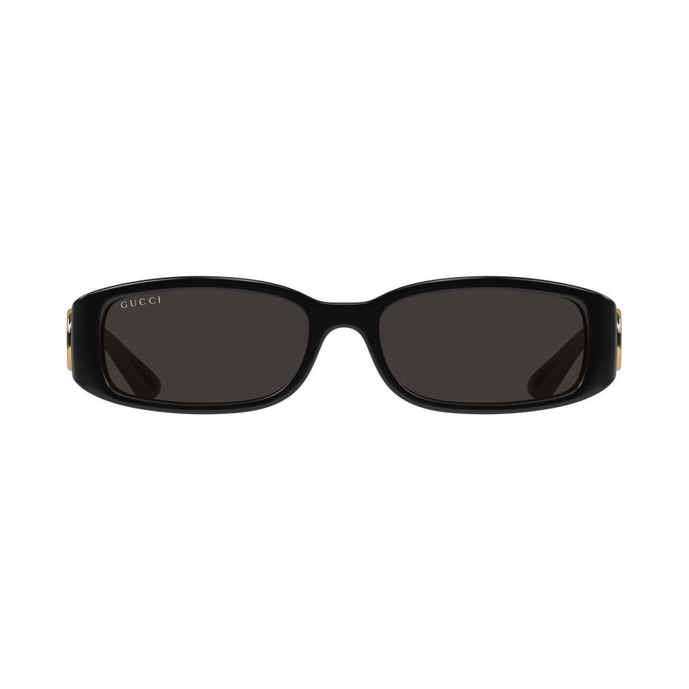 Occhiali da sole Gucci in acetato nero con forma ovale rettangolare e lenti grigio scuro. Iconico dettaglio GG dorato sulle aste per uno stile deciso e riconoscibile.