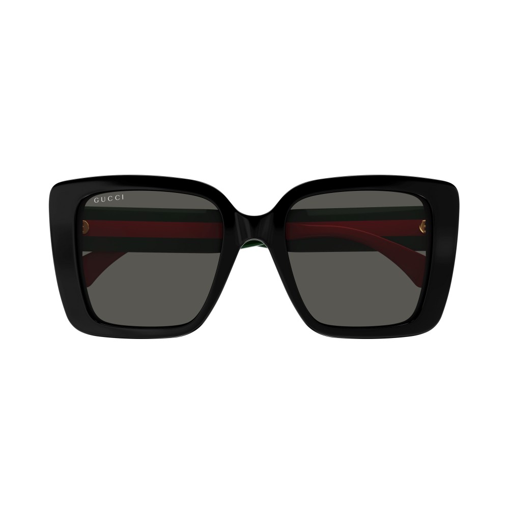 Le lenti grigio scuro garantiscono comfort visivo nella luce intensa e una visione equilibrata nelle diverse condizioni di luminosità. Le aste spesse integrano la storica banda Web verde e rossa, accompagnata dal logo GG dorato, dettaglio iconico del marchio Gucci.