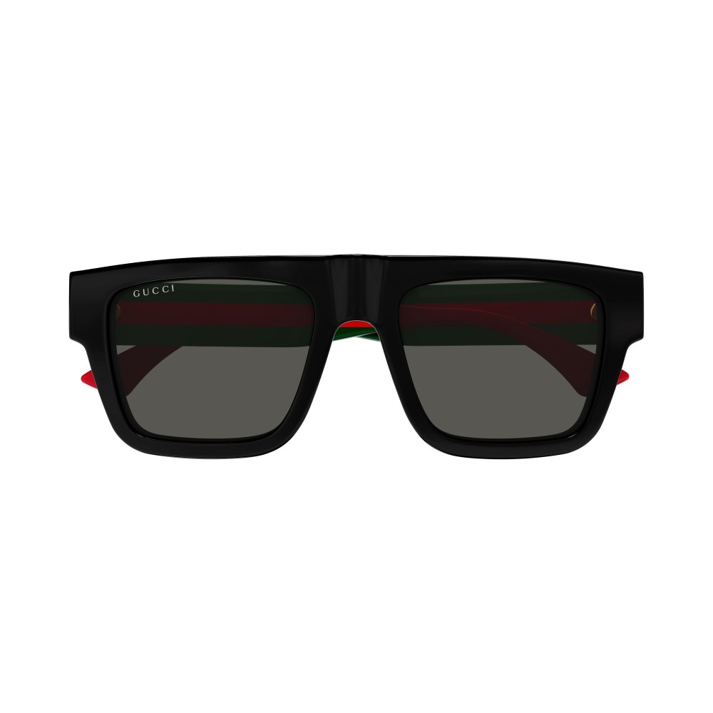 Occhiali da sole Gucci con montatura nera lucida e aste iconiche verde e rosso. Design deciso, linee squadrate, lenti scure. Stile Gucci immediato, pensato per chi cerca un accessorio riconoscibile e di carattere.