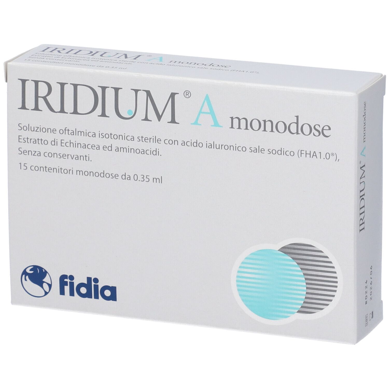 Iridium A Monodose è una soluzione oftalmica isotonica sterile senza conservanti, studiata per il benessere quotidiano della superficie oculare. La formula associa acido ialuronico sale sodico FHA 1.0, estratto di Echinacea e aminoacidi, favorendo idratazione, protezione e comfort visivo.