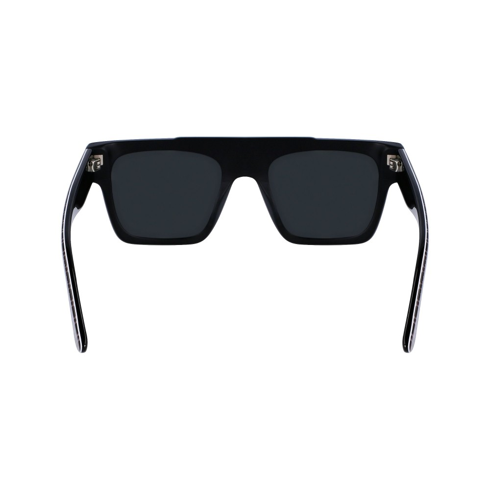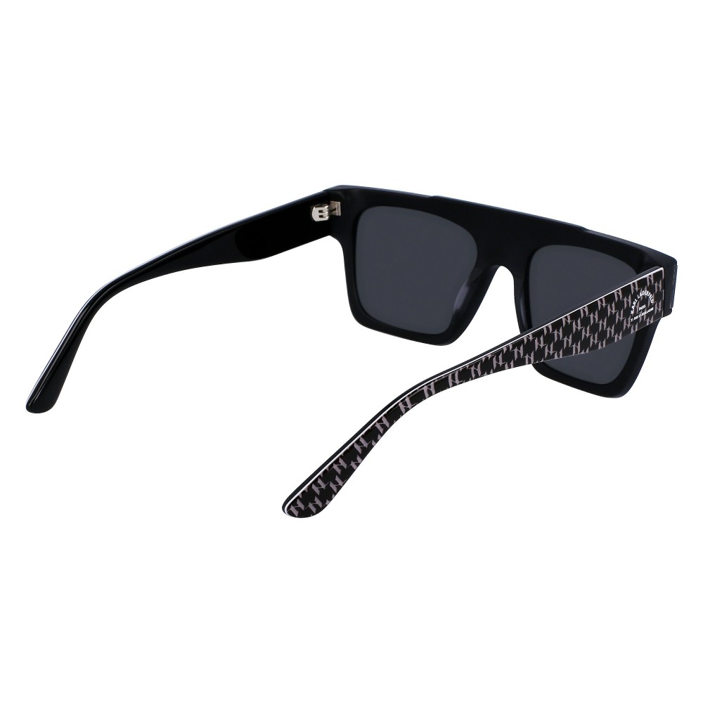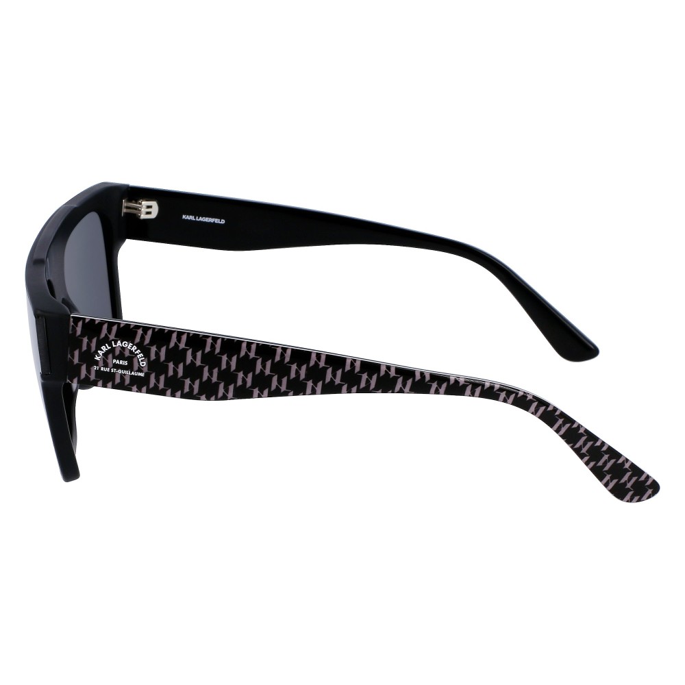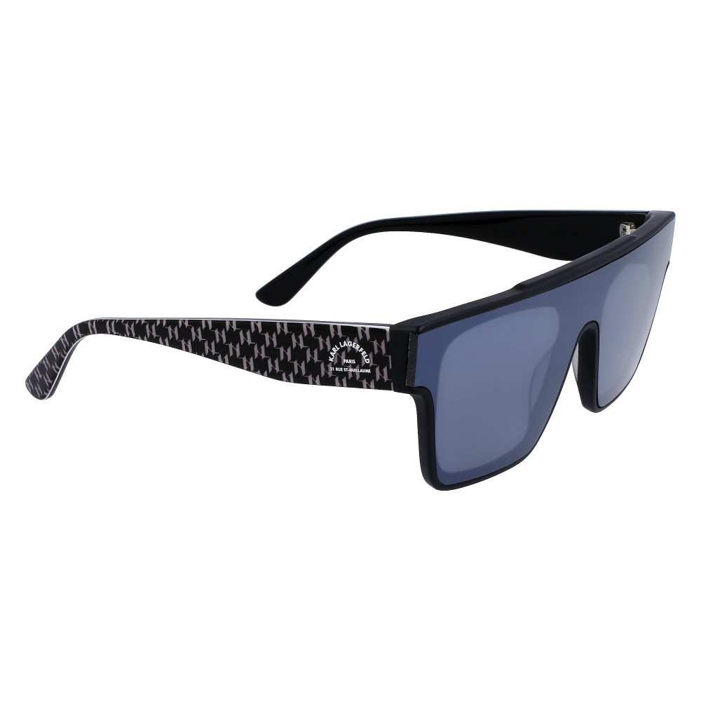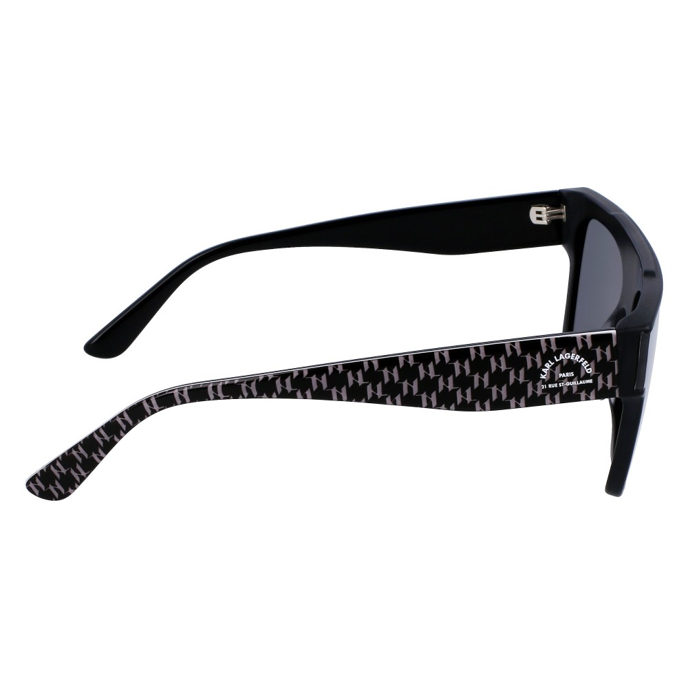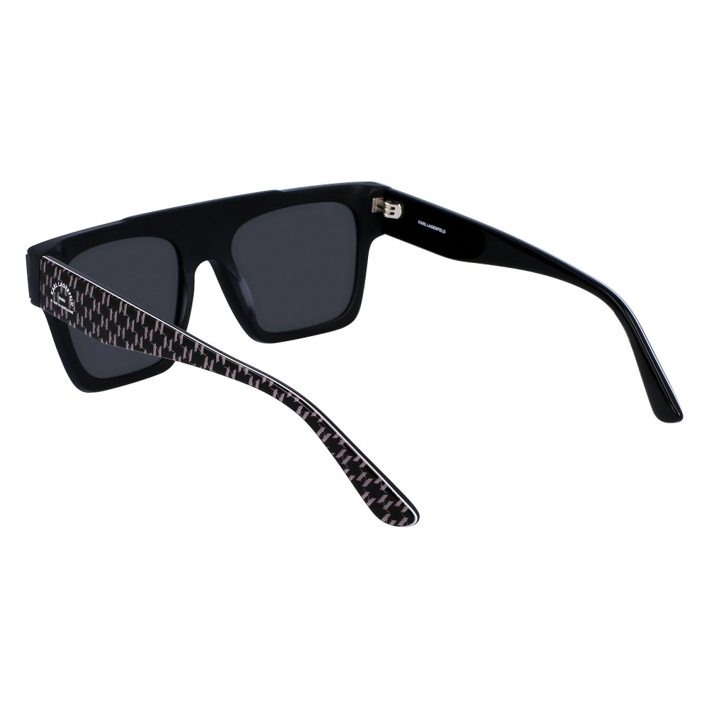 Il frontale ampio con forma a mascherina squadrata dona carattere al viso. La montatura nera esalta le linee pulite e rende il modello facile da abbinare a qualsiasi outfit. Le aste presentano il dettaglio grafico Karl Lagerfeld, segno distintivo del brand.