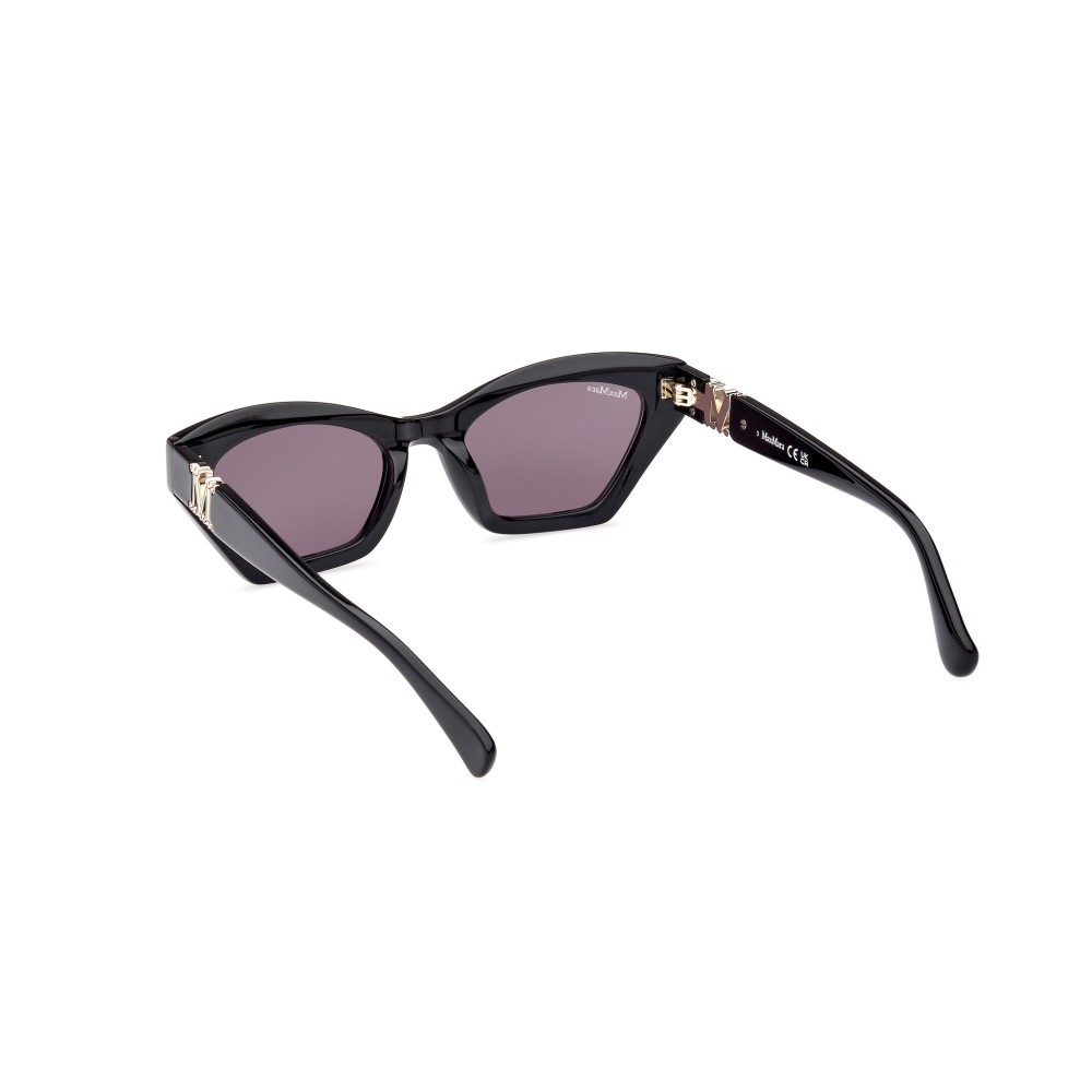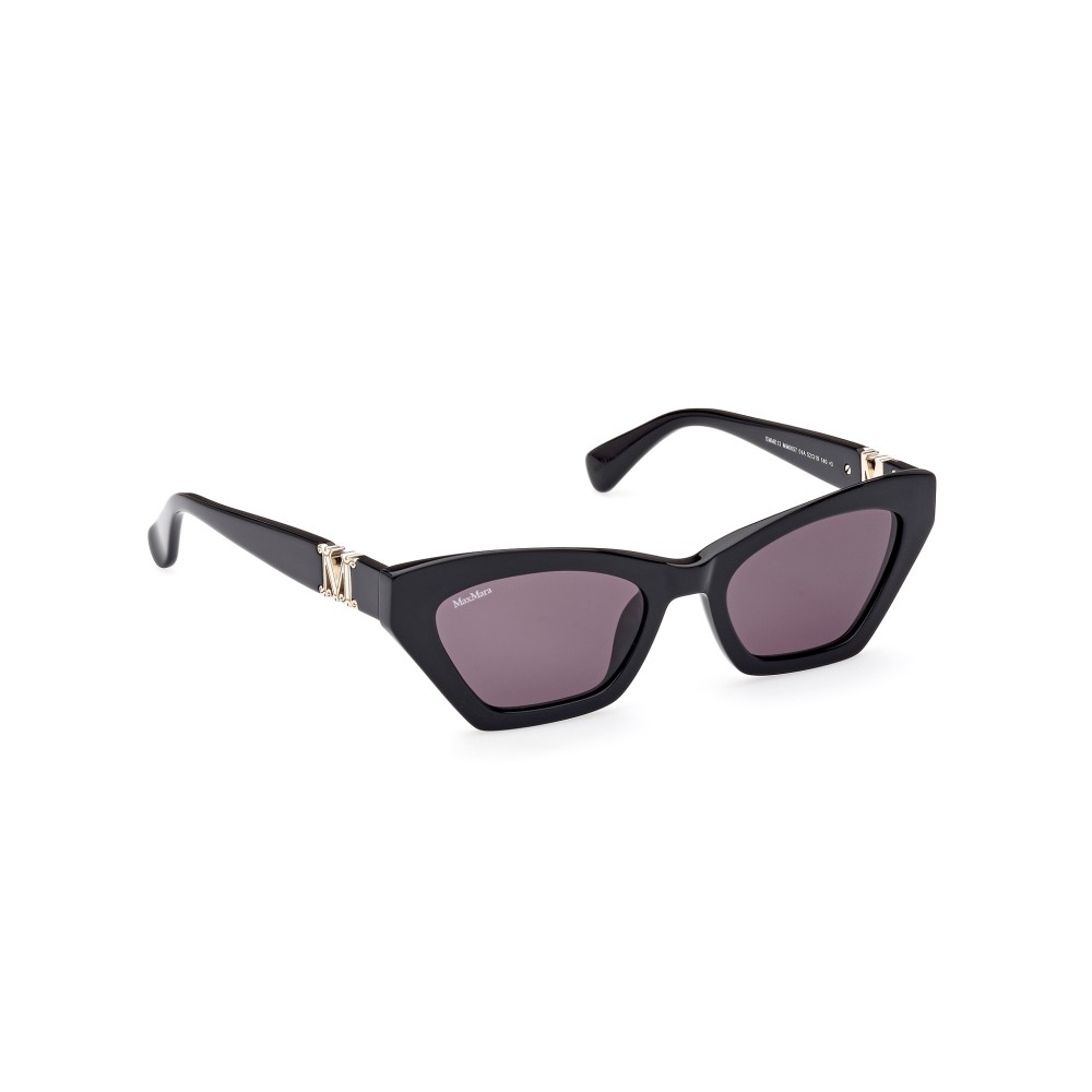 Occhiali da sole Max Mara donna con montatura nera dalla forma cat eye decisa e contemporanea. Lenti grigio sfumato con protezione UV e dettaglio logo M in metallo dorato sulle aste. Modello elegante e distintivo, ideale per completare outfit casual e raffinati.