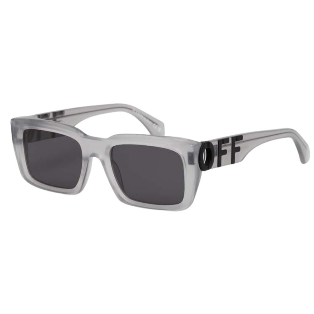 Occhiali da sole Off-White con montatura trasparente effetto ghiaccio e design rettangolare compatto. Iconico logo “OFF” laterale e lenti grigie per una visione confortevole e pulita.
