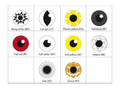 | Colore | Bang White, Cat Eye, Flower Yellow, Full Black, Full Red, Full White, Full Yellow, Hearts, Sun, Zucca |