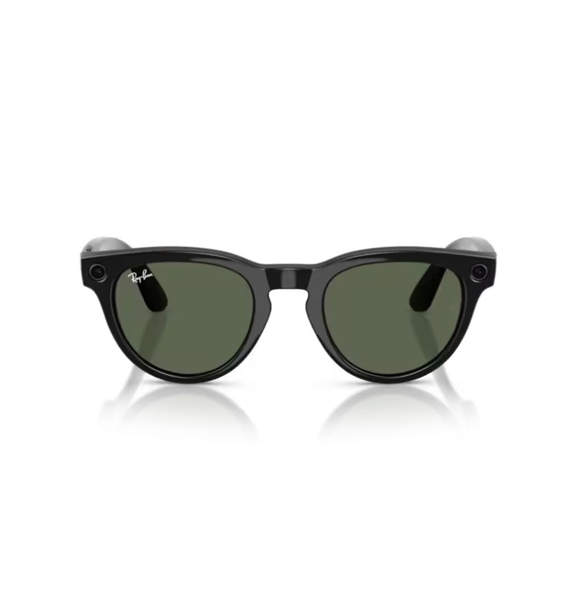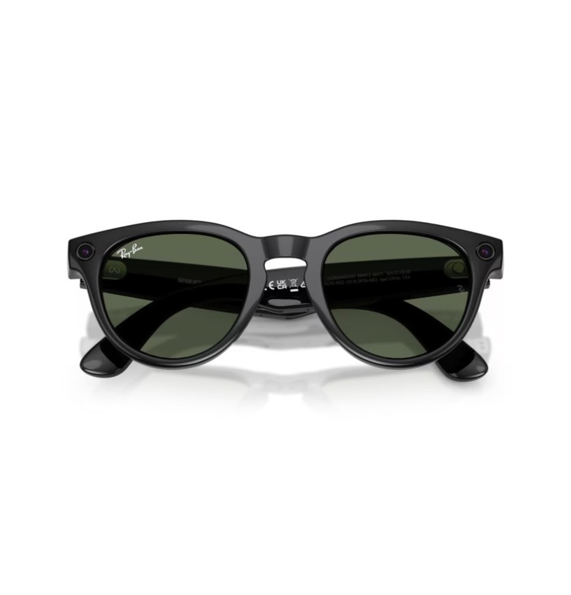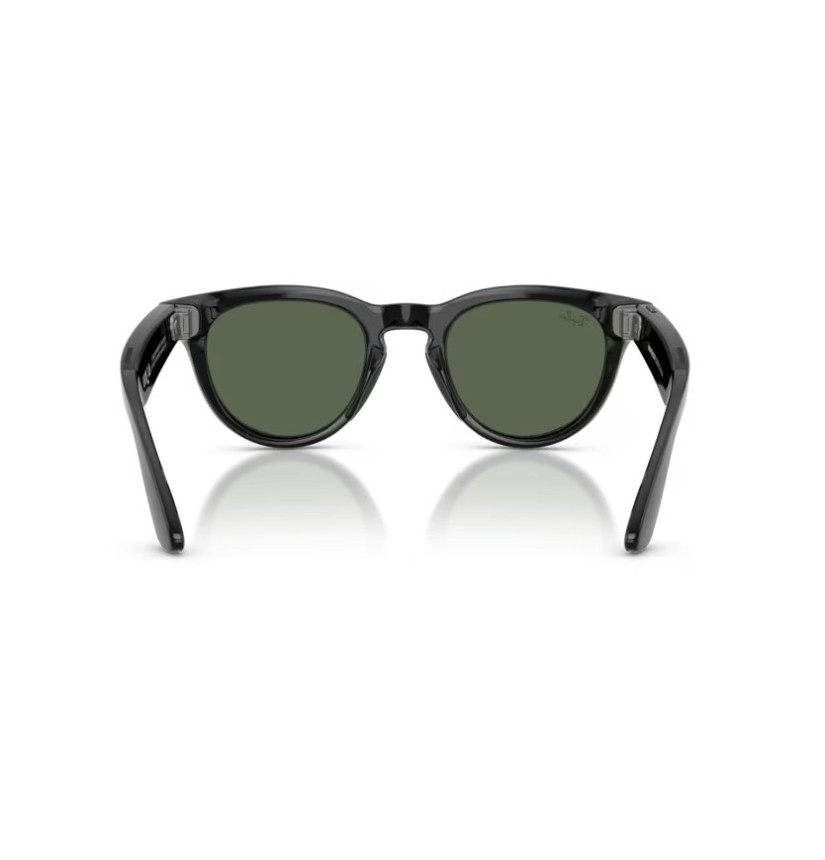 Occhiali smart con Meta AI dal design classico, ideali per foto, video e comunicazione senza usare lo smartphone. Montatura nero lucido con lenti G-15 verde, trasparenti in interno e scure all’esterno, con protezione totale UVA e UVB.