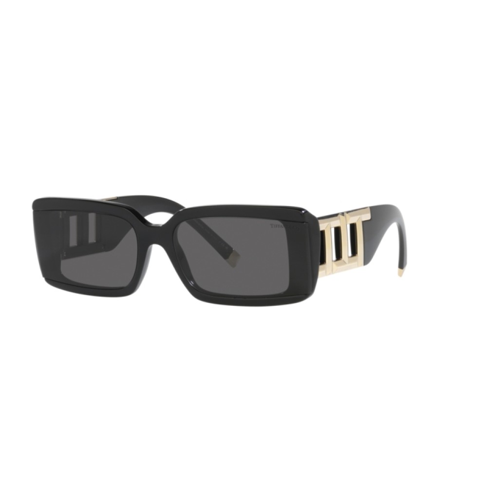 Occhiali da sole Tiffany & Co con montatura rettangolare in acetato nero e lenti grigio scuro. Aste bold con dettaglio T in metallo color oro, look deciso e riconoscibile. Ideali se cerchi un occhiale di lusso per outfit urbano e occasioni speciali, con protezione UV.