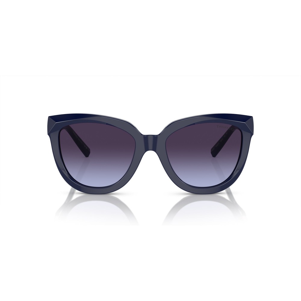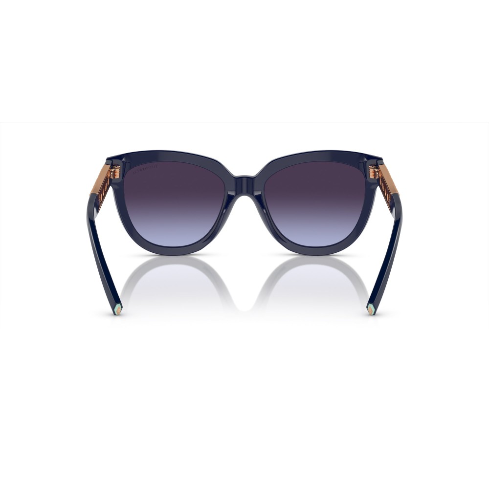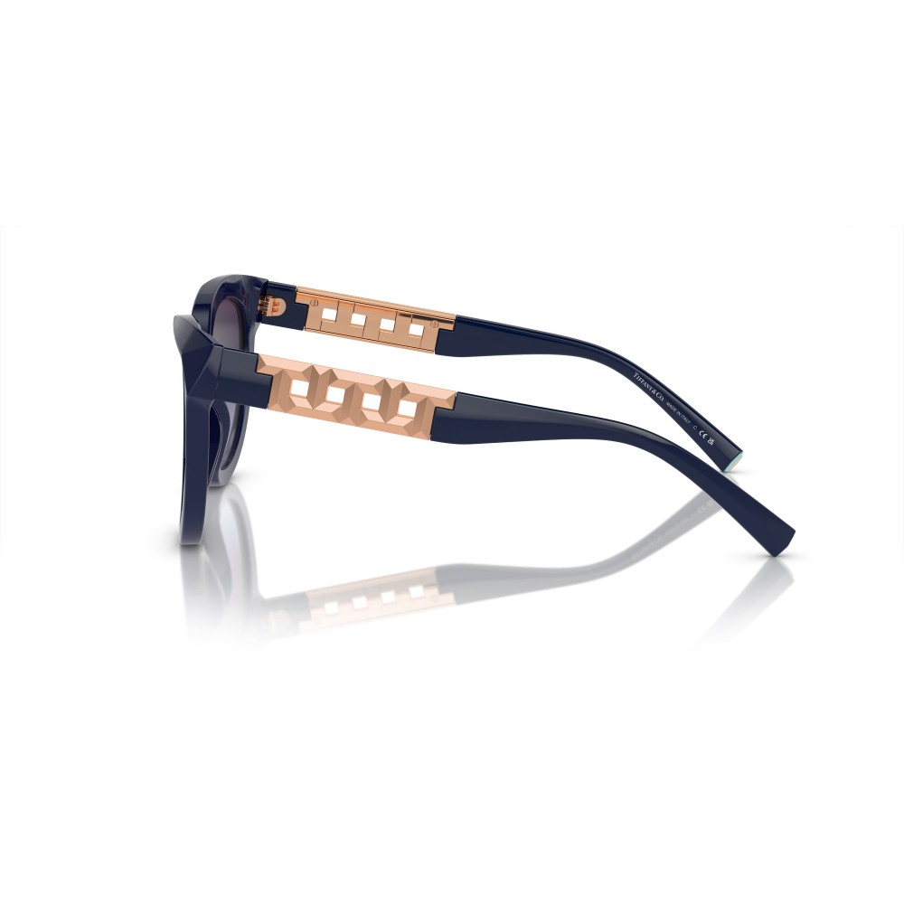 Occhiali da sole Tiffany & Co da donna con montatura blu lucido dalla forma cat-eye moderna. Lenti sfumate eleganti e aste impreziosite da inserti metallici color oro rosa ispirati al design iconico Tiffany. Protezione UV totale e stile raffinato per un look distintivo.