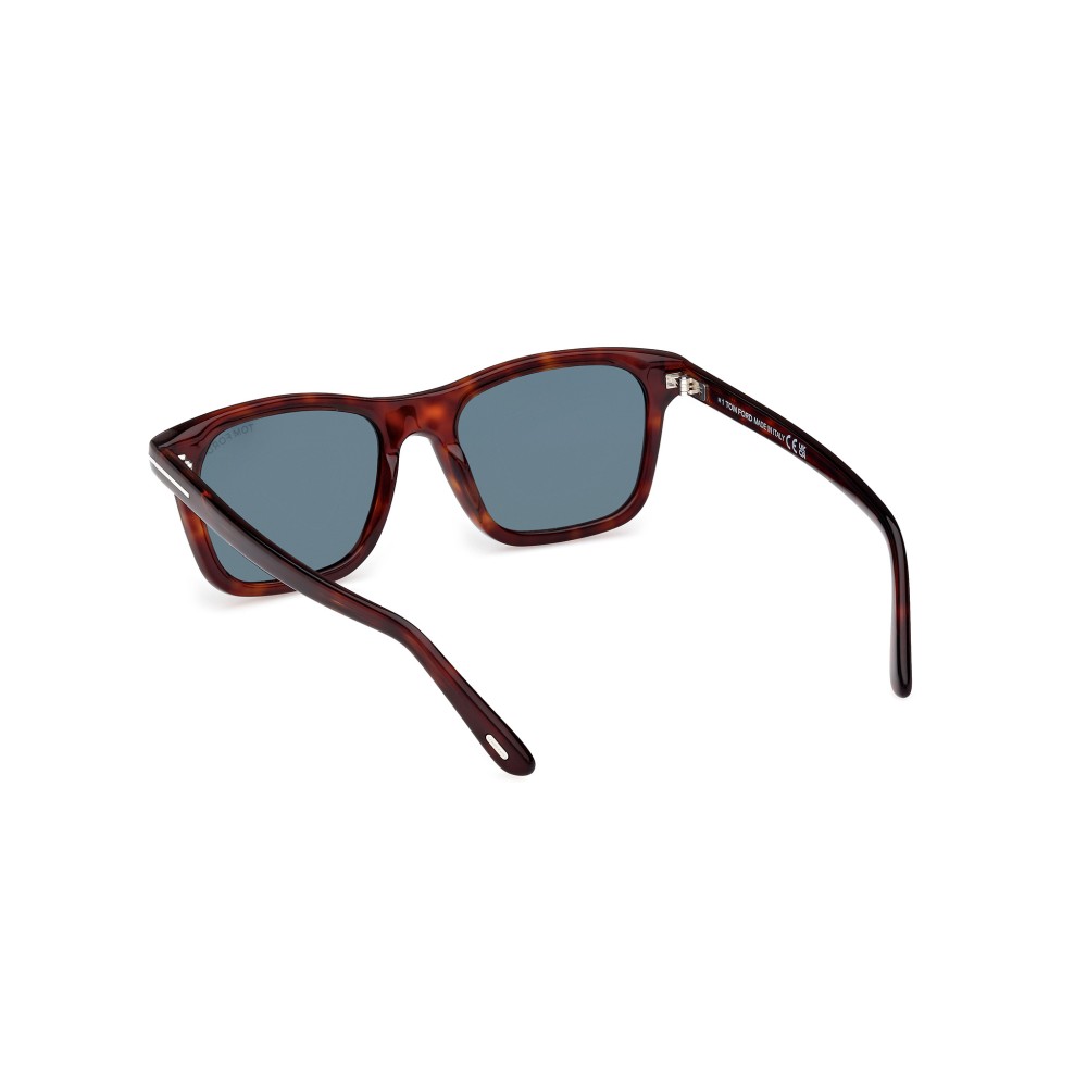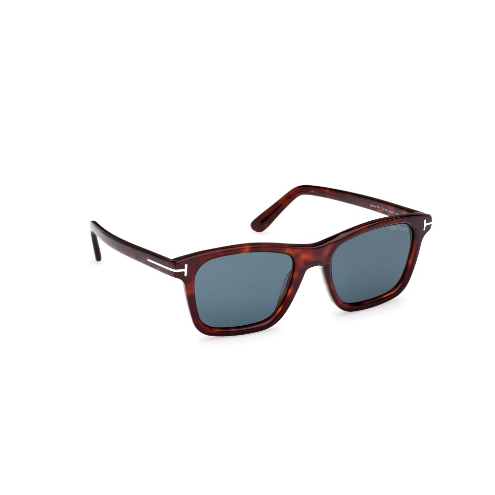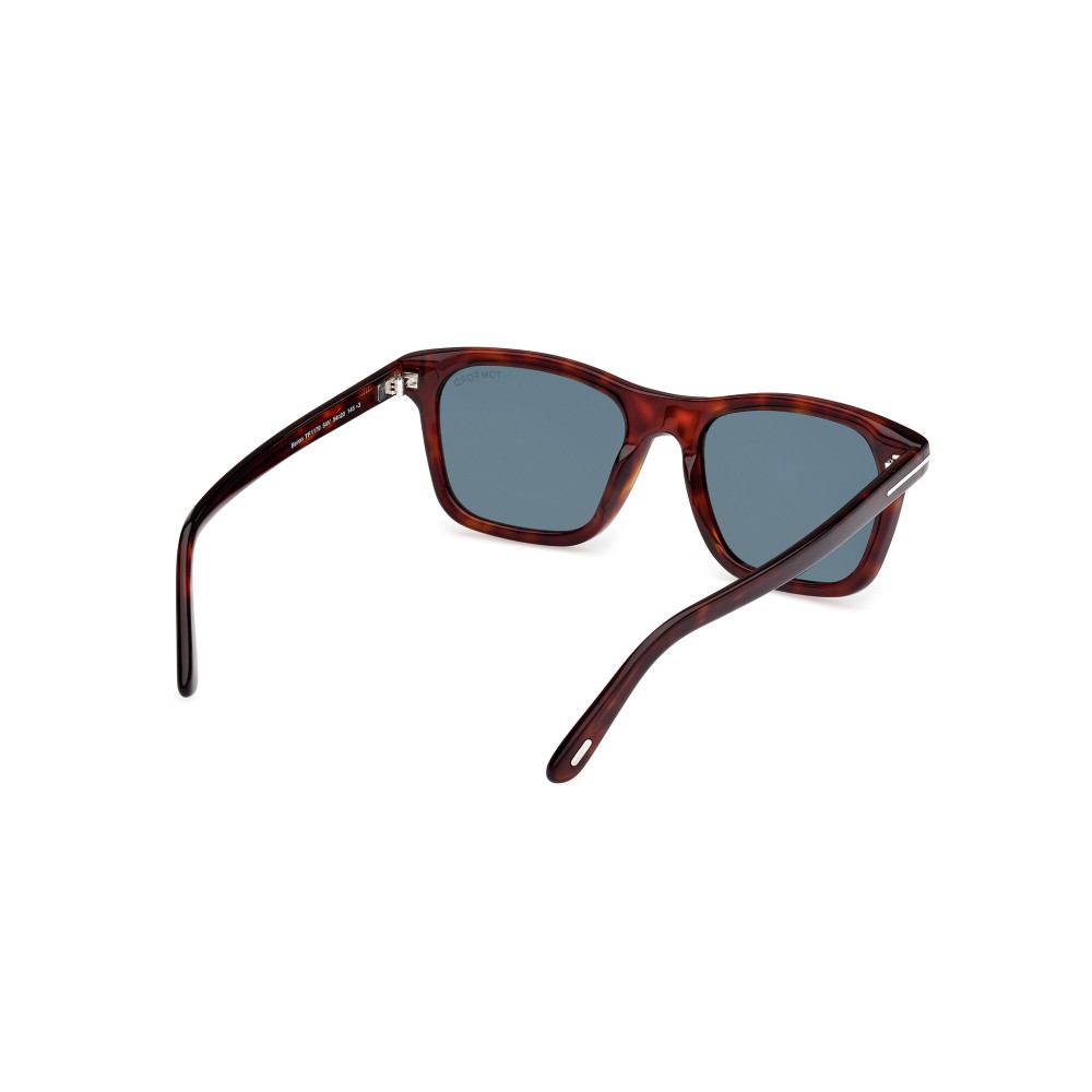 Occhiali da sole Tom Ford dal design elegante e deciso. Montatura in acetato tartarugato scuro con iconico dettaglio metallico a T sulle aste. Lenti grigio-blu che garantiscono protezione solare e stile raffinato, ideali per un look quotidiano ricercato.