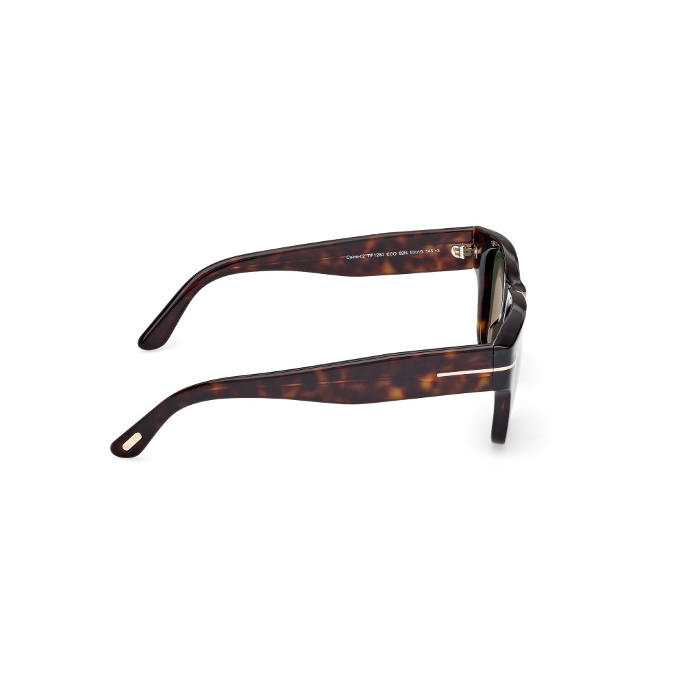 Tom Ford FT1280 52N 5319. Occhiali da sole da donna in acetato havana scuro con profilo deciso e angoli leggermente rialzati. Iconico dettaglio “T” sulle aste e lenti verdi per un look elegante e riconoscibile.